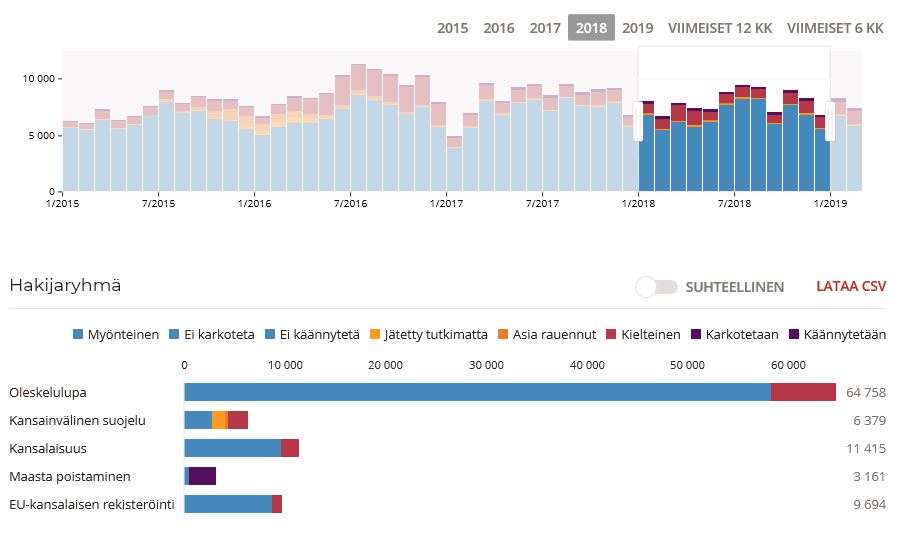 Liikuta aikajanaa ja tutki tilastoja eri vuosilta ja ajanjaksoilta. Palvelussa voit jopa tarkastella esimerkiksi minkälaisia oleskelulupapäätöksiä ghanalaiset Suomen kansalaisten huoltajat saivat viime kuussa ja montako brittiä rekisteröi oleskeluoikeutensa Suomessa. Jos et osaa käyttää tilastopalvelua, ei hätää! Verkkosivuiltamme löydät ohjeet palvelun käyttöön.