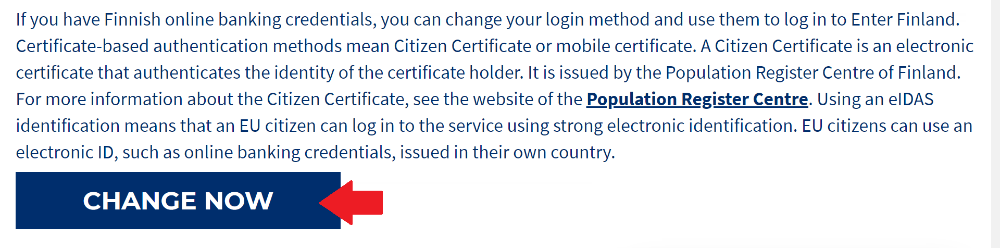 Log in to the online service Enter Finland using your Finnish online banking credentials, Citizen Certificate or mobile certificate. When you log in to the online service with one of these three options, you are using strong identification.