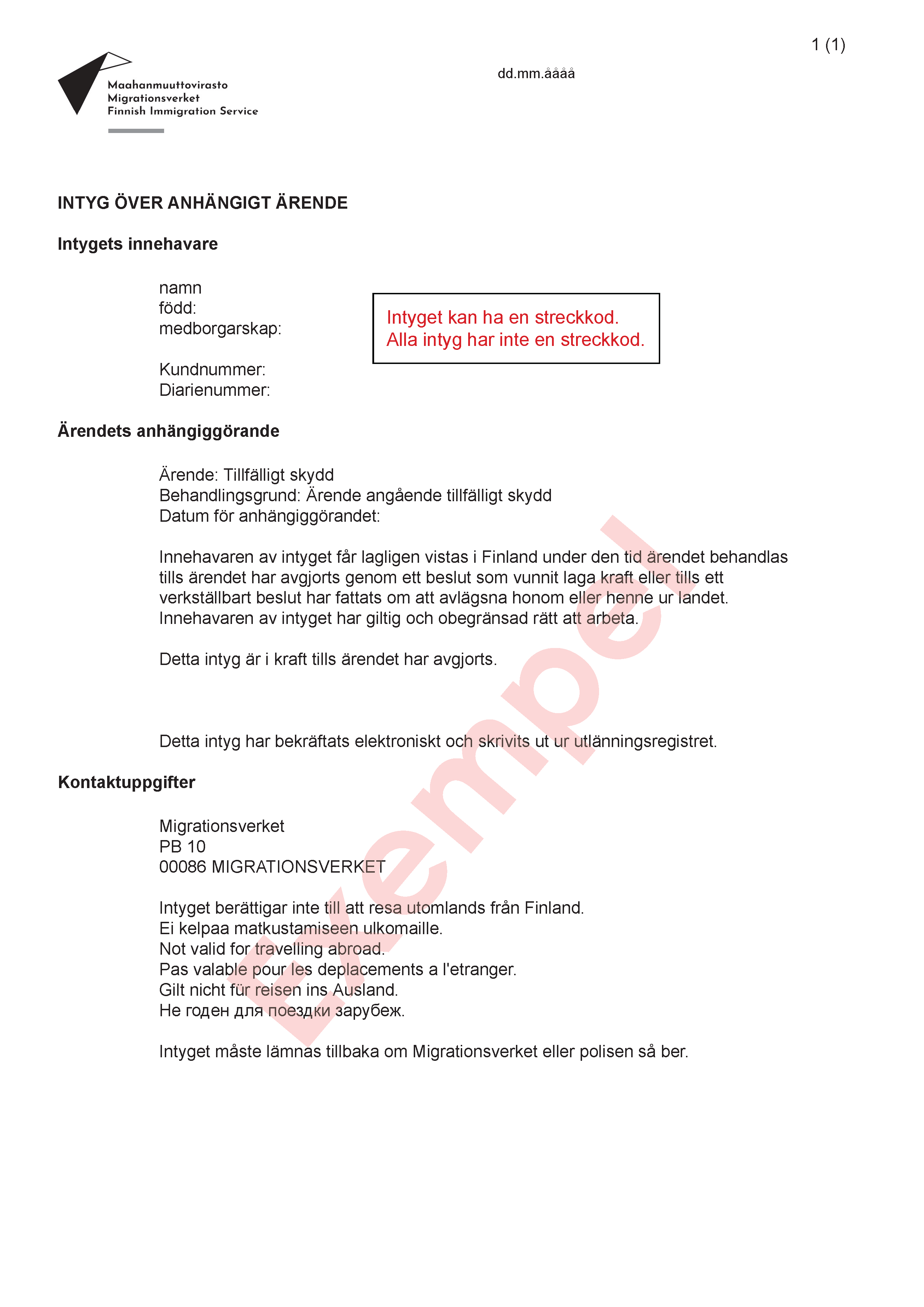 - Om du redan har ansökt om tillfälligt skydd men inte fått intyg över inlämnad ansökan (pdf) från polisen eller gränsmyndigheten, kan vi skicka intyget till dig per e-post. Begär intyg genom att skicka e-post till migri@migri.fi. Om du ännu inte har hittat arbete och inte behöver intyget, kan du vänta på beslutet.