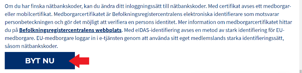 2. Klicka på ”Byt nu” för att komma till inloggningssidan Suomi.fi. Där kan du logga in i e-tjänsten genom att använda stark autentisering, till exempel dina finska nätbankskoder.